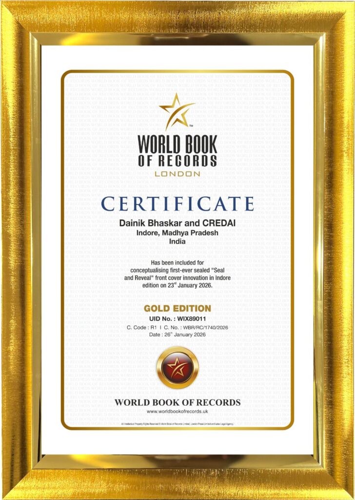 Indore, Madhya Pradesh: The CREDAI Property Show 2026, organized in Indore, has created history by earning prestigious recognition from World Book of Records UK, for conceptualizing India’s first-ever sealed “Seal & Reveal” front-cover innovation in collaboration with Dainik Bhaskar, Indore edition. The certification acknowledges the innovative concept unveiled in the Indore edition dated 23 January 2026, marking a significant milestone in print media and real estate exhibition promotion.