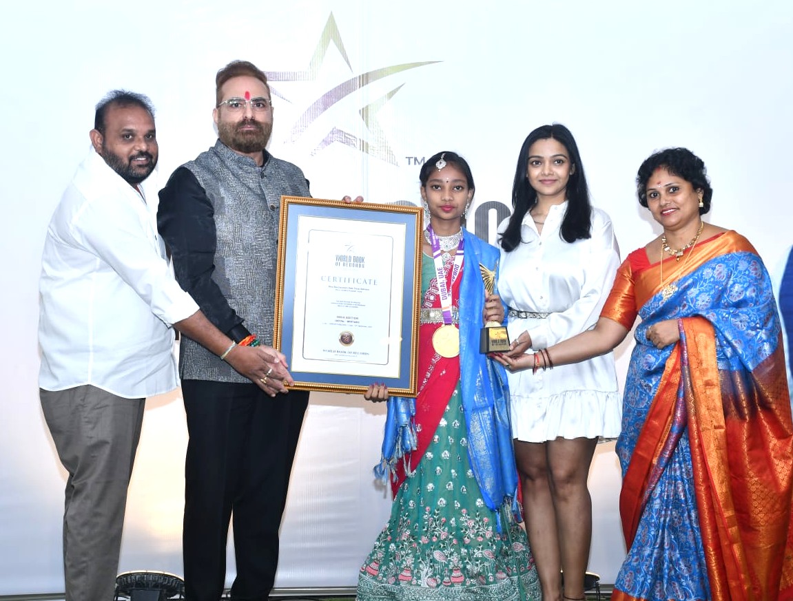 Miss Machavaram Sree Tulasi Sahasra, daughter of Satish Kumar Machavaram from Eluru, Andhra Pradesh, has achieved a remarkable feat by being included in World Book of Records UK, for being the fastest to recite 700 shlokas of the Bhagavad Gita in an impressive 52 minutes and 4 seconds. The certificate was bestowed by WBR Chartered Officer Dr. Jitendra Matlani, along with renowned actress Nithya Shetty, in a felicitation ceremony held in Hyderabad.