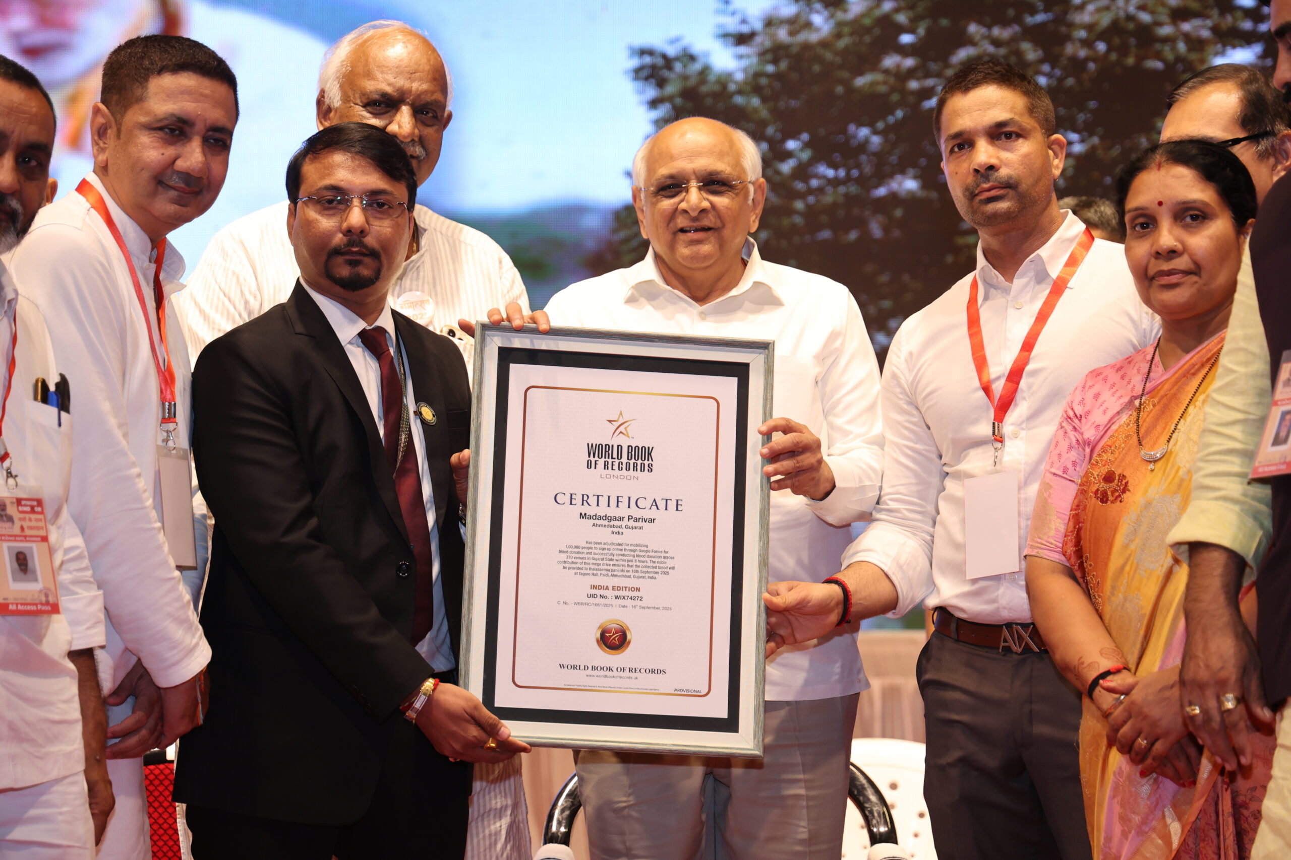 Ahmedabad, Gujarat : In a historic humanitarian effort, Madadgaar Parivar has been officially recognized by World Book of Records UK for mobilizing an unprecedented 1,00,000 people through online sign-ups and successfully conducting blood donation across 370 venues in Gujarat within just 8 hours.