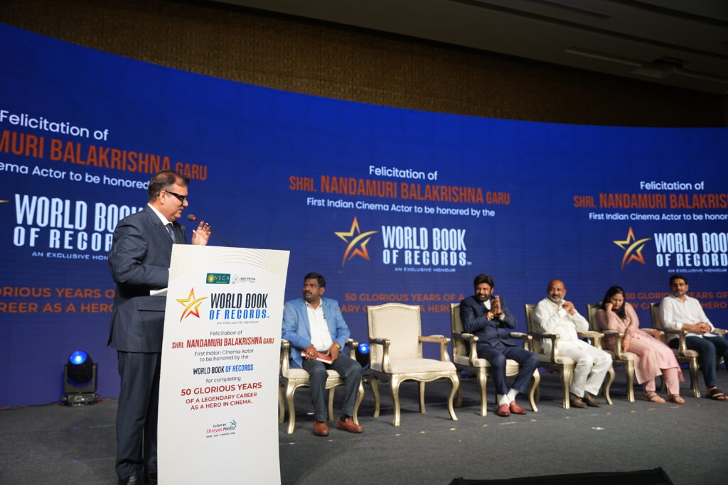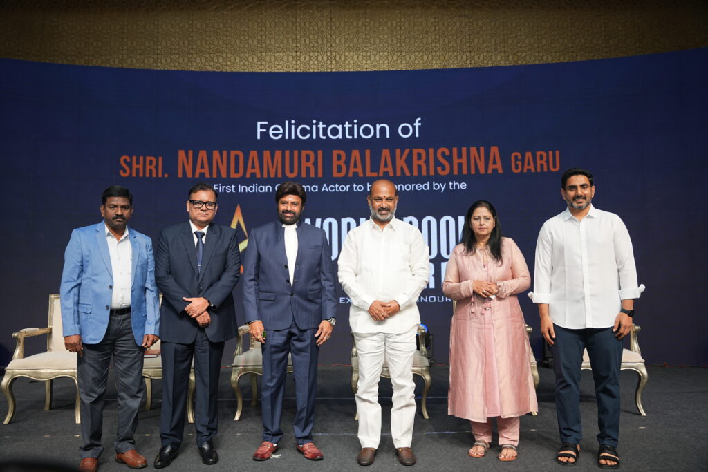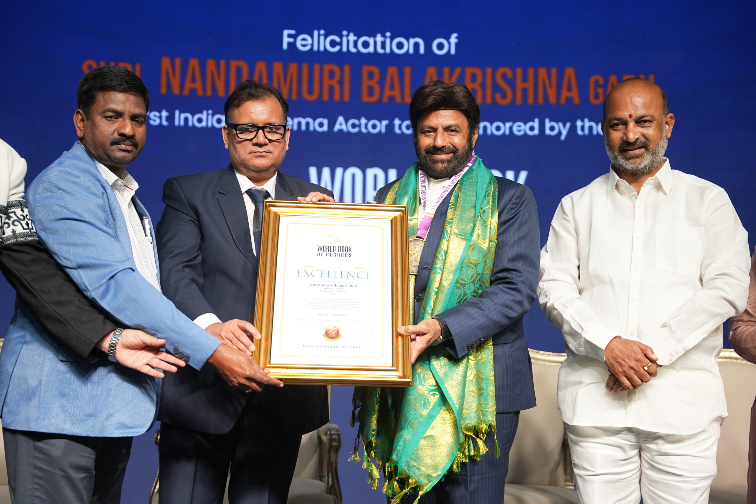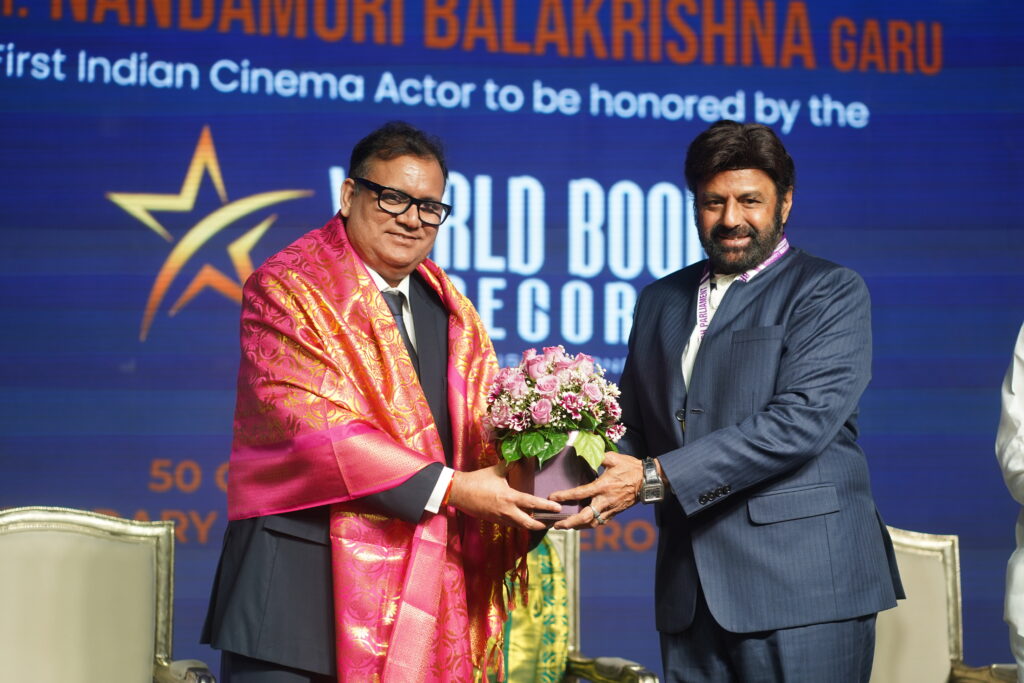 On this special occasion, members of the Central Working Committee of World Book of Records and international dignitaries congratulated Balakrishna for his remarkable journey and contribution to Indian cinema.