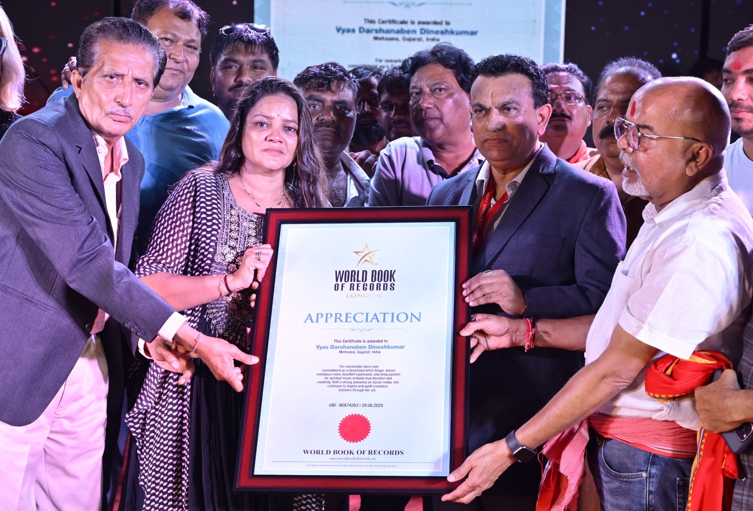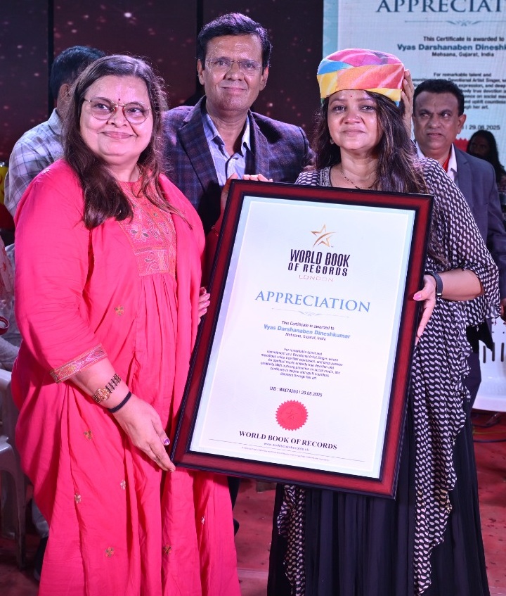 Mehsana/Gujarat: Famous folk singer Darshana Vyas, popularly known as the Khelaiya Garba Queen, was honoured by World Book of Records UK at a service camp in Ambaji. The certificate of honour was presented by Dr. Ashwinbhai Trivedi, Advocate and President of World Book of Records, Gujarat.